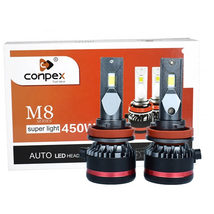 برند کانپکس conpex یکی از شرکتهای معروف در زمینه تولید لامپ خودرو و هدلایت میباشد . هد لایت مدل M8 نیز از مدلهای با کیفیت و پر فروش شرکت کانپکس میباشد که از چیپ CSP در دو طرف بدنه استفاده شده است . دارای 45 وات توان مصرفی هر عدد از هدلایتها میباشد.این مدل در پایه H7 برای بیشتر ماشینهای ایرانی و خارجی مورد استفاده قرار میگیرد.